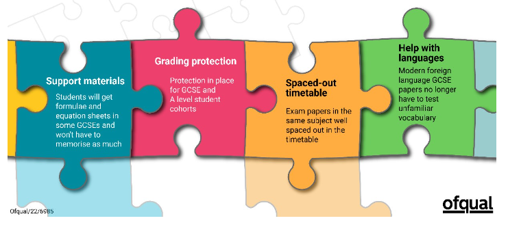 GCSE and A-Levels 2023 Ofqual (Office of Qualification and Exam Regulation) have published a student guide to the 2023 exam season. This can be found here and corresponding parent guide can also be found here. The information details the key support available for students studying GCSE and A-Levels. The image below summarises these changes.